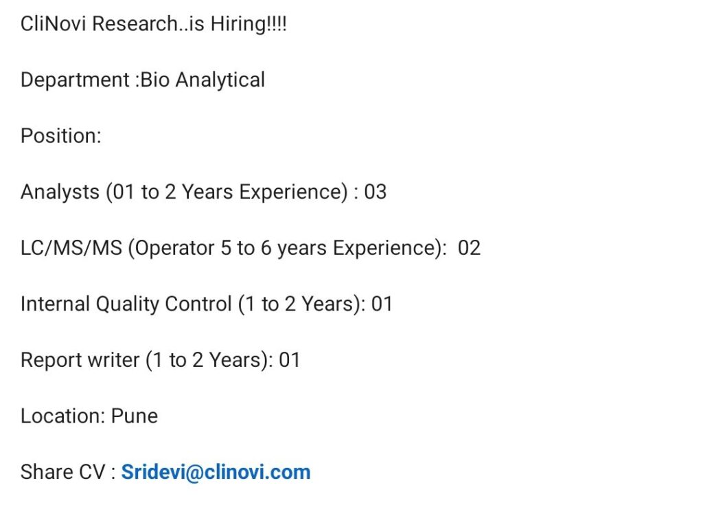 #BioAnalyticalJobs #PuneJobs #ClinoviResearch #PharmaJobs #HiringNow