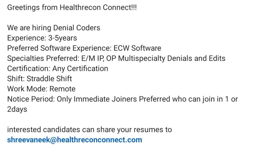💥 Healthcareon Connect Hiring | Denial Coders | Work From Home