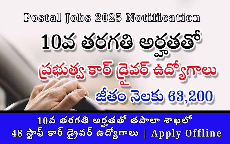 🚗📮 Postal Jobs 2025 Notification | 10వ తరగతి అర్హతతో తపాలా శాఖలో 48 స్టాఫ్ కార్ డ్రైవర్ ఉద్యోగాలు | Apply Offline