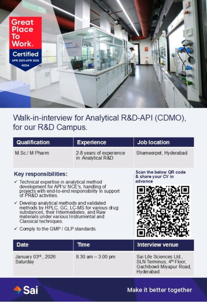 💥 Sai Life Sciences Ltd Walk-In Interview 2026 | Analytical R&D Jobs (API – CDMO)