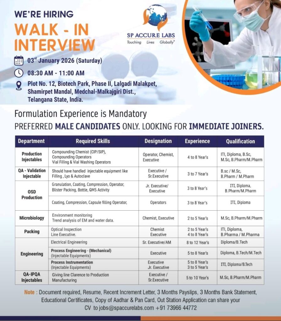 SP Accure Labs Walk-In Interview 2026 | Injectables, QA, OSD, Microbiology & Engineering Jobs – Hyderabad