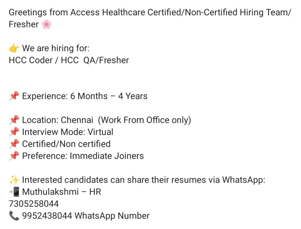Access Healthcare Hiring: HCC Coders & QA Analysts | Chennai | Virtual Interview