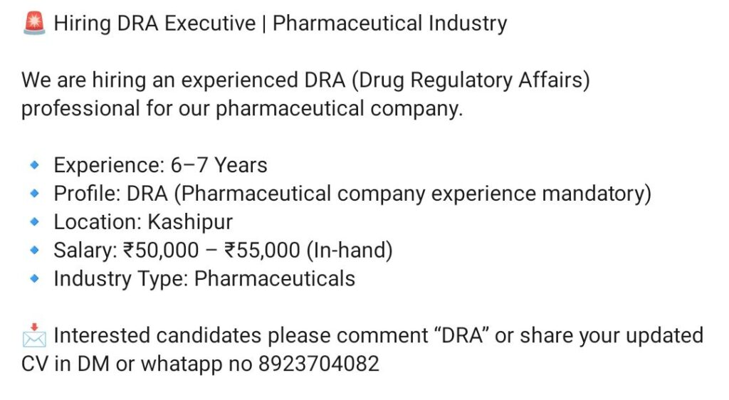 HomeHomeDRA Executive Position at Pharma Company – Kashipur, Salary ₹50,000 – ₹55,000 DRA Executive Position at Pharma Company – Kashipur, Salary ₹50,000 – ₹55,000 chandrakanth January 17, 2026 Post Views: 13 Related posts: SSterling Hospitals Hiring 2025 | Medical Officer, Staff Nurse & Assistant Manager Jobs AP కాంట్రాక్ట్ / అవుట్సోర్సింగ్ ఉద్యోగాలు 2025 | RMC Jobs Recruitment 2025 | అర్హత & దరఖాస్తు వివరాలు Walk-in Interview at Cipla for OSD Operators & Officers | Patalganga, 8-9 Jan 2026 Hiring: Scientific/Medical Writer (Publications) – Remote India, Up to ₹20 LPA Share Pinterest Tweet Email Linkedin Whatsapp Telegram Prev Article Next Article Leave a Reply Cancel Reply Save my name, email, and website in this browser for the next time I comment.