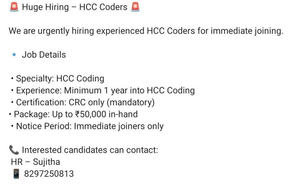 HomePharma JobsHCC Medical Coding Jobs (CRC) | High Salary | Immediate Joining Available HCC Medical Coding Jobs (CRC) | High Salary | Immediate Joining Available chandrakanth January 9, 2026 Post Views: 23 Related posts: Unilever Jobs for Freshers | Associate Global Market Vigilance (Pharmacovigilance) Sun Pharmaceutical Industries Hiring 2026 | Executive – Analytical Development R&D Jobs – Baroda “Intas Pharmaceuticals Walk In Drive 2025 | Jobs in Multiple Departments” Merck Business Executive Job for Fresh Graduates | Pharma Careers India Share Pinterest Tweet Email Linkedin Whatsapp Telegram Prev Article Next Article Leave a Reply Cancel Reply Save my name, email, and website in this browser for the next time I comment.