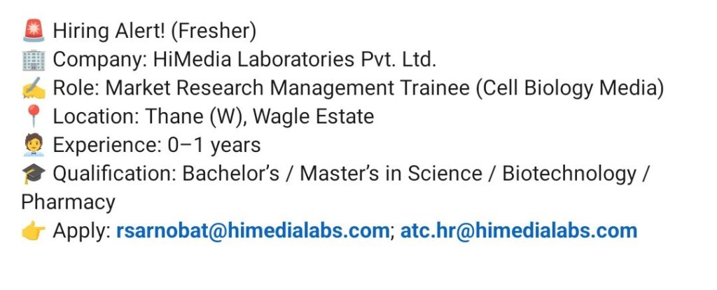 HomeHomeHiring Freshers: Market Research Management Trainee – Cell Biology Media | HiMedia Laboratories, Thane Hiring Freshers: Market Research Management Trainee – Cell Biology Media | HiMedia Laboratories, Thane chandrakanth January 9, 2026 Post Views: 16 Related posts: 📢 Granules India Limited Hiring – Walk-in 20th Dec | Pharma / Production / QA / QC SSterling Hospitals Hiring 2025 | Medical Officer, Staff Nurse & Assistant Manager Jobs Avantika Medex Pvt Ltd Ahmedabad | Pharma Job Openings 2025 AP కాంట్రాక్ట్ / అవుట్సోర్సింగ్ ఉద్యోగాలు 2025 | RMC Jobs Recruitment 2025 | అర్హత & దరఖాస్తు వివరాలు Share Pinterest Tweet Email Linkedin Whatsapp Telegram Prev Article Next Article Leave a Reply Cancel Reply Save my name, email, and website in this browser for the next time I comment.