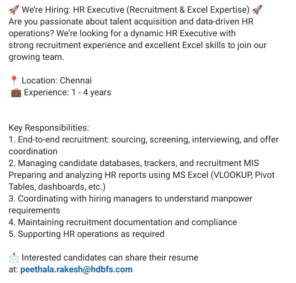 Hiring HR Executive: Talent Acquisition & MIS Reporting | Excel Skills Required | Chennai