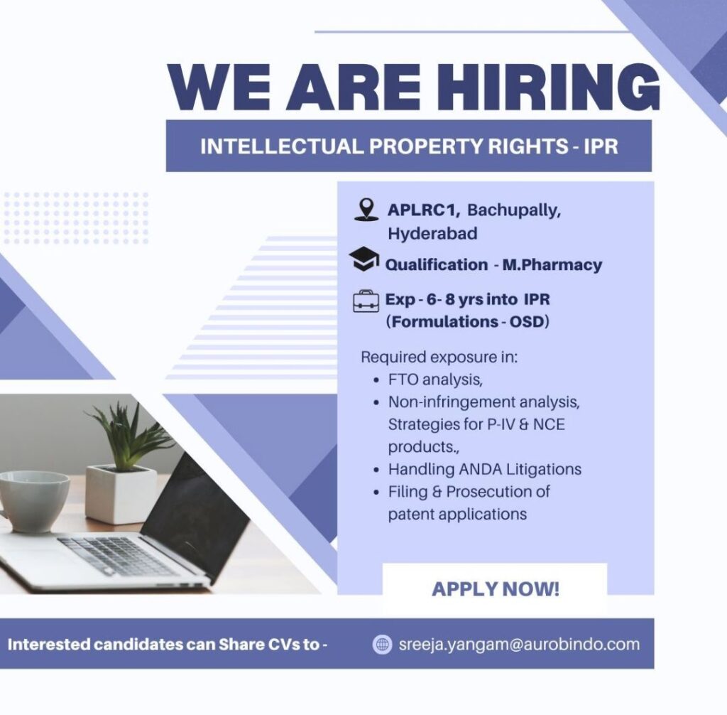 Hiring IPR Patent Expert – M.Pharmacy, FTO, ANDA Litigation – Aurobindo, Hyderabad