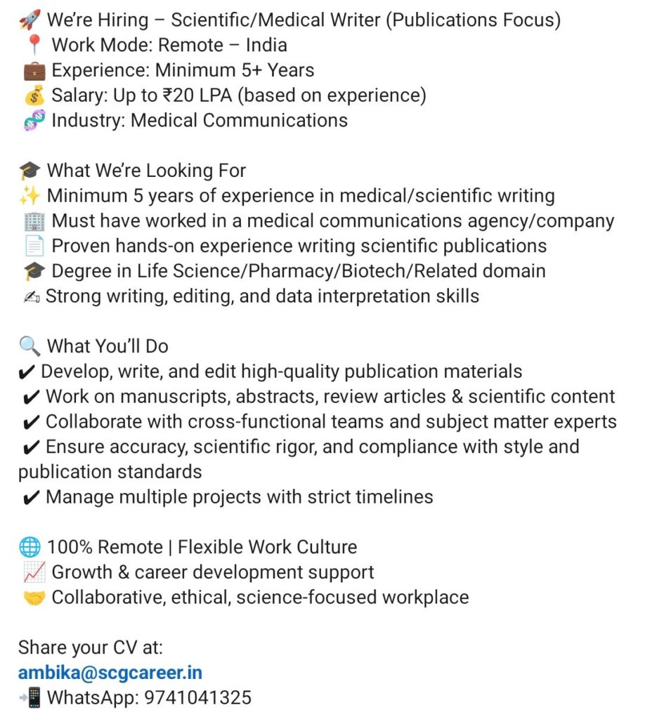 HomeHomeHiring: Scientific/Medical Writer (Publications) – Remote India, Up to ₹20 LPA Hiring: Scientific/Medical Writer (Publications) – Remote India, Up to ₹20 LPA chandrakanth January 12, 2026 Post Views: 17 Related posts: 📢 Granules India Limited Hiring – Walk-in 20th Dec | Pharma / Production / QA / QC SSterling Hospitals Hiring 2025 | Medical Officer, Staff Nurse & Assistant Manager Jobs AP కాంట్రాక్ట్ / అవుట్సోర్సింగ్ ఉద్యోగాలు 2025 | RMC Jobs Recruitment 2025 | అర్హత & దరఖాస్తు వివరాలు BI Analyst Hiring | Data Analytics Job | 2+ Years Experience Share Pinterest Tweet Email Linkedin Whatsapp Telegram Prev Article Next Article Leave a Reply Cancel Reply Save my name, email, and website in this browser for the next time I comment.