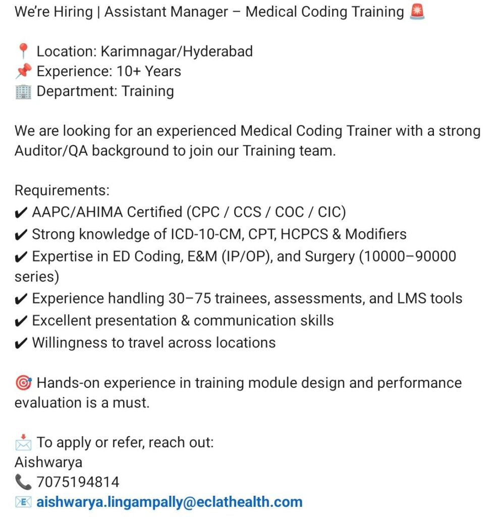 HomePharma JobsMedical Coding Trainer Job – Assistant Manager | AAPC/AHIMA Certified (CPC, CCS) | Hyderabad Medical Coding Trainer Job – Assistant Manager | AAPC/AHIMA Certified (CPC, CCS) | Hyderabad chandrakanth January 9, 2026 Post Views: 13 Related posts: Unilever Jobs for Freshers | Associate Global Market Vigilance (Pharmacovigilance) Sun Pharmaceutical Industries Hiring 2026 | Executive – Analytical Development R&D Jobs – Baroda “Intas Pharmaceuticals Walk In Drive 2025 | Jobs in Multiple Departments” “Lubrizol Careers 2025 | Hiring Production Executive – Navi Mumbai Maharashtra” Share Pinterest Tweet Email Linkedin Whatsapp Telegram Prev Article Next Article Leave a Reply Cancel Reply Save my name, email, and website in this browser for the next time I comment.
