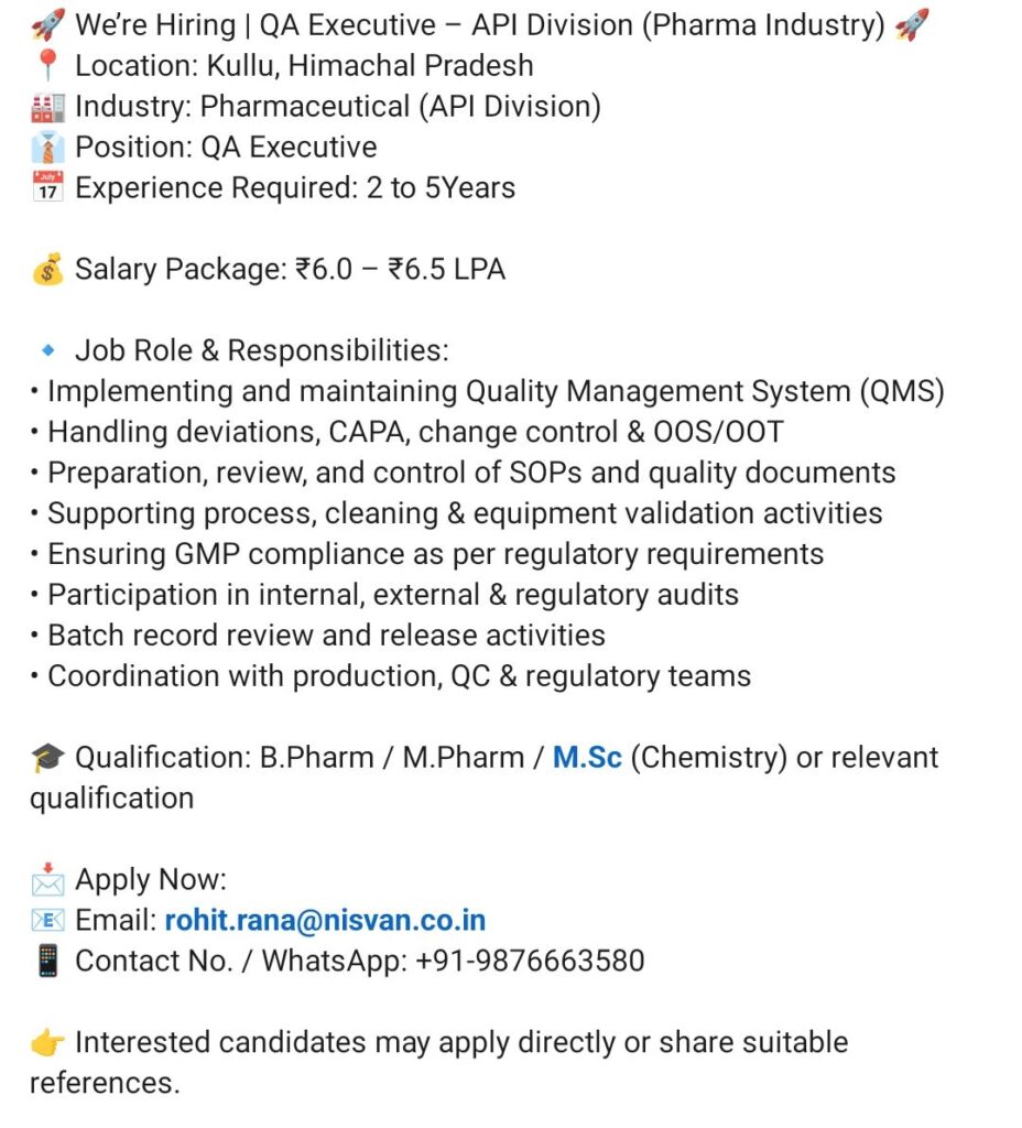 HomePharma JobsQA Executive – GMP, Validation, QMS | API Pharma Industry | Kullu QA Executive – GMP, Validation, QMS | API Pharma Industry | Kullu chandrakanth January 9, 2026 Post Views: 19 Related posts: Unilever Jobs for Freshers | Associate Global Market Vigilance (Pharmacovigilance) Sun Pharmaceutical Industries Hiring 2026 | Executive – Analytical Development R&D Jobs – Baroda “Intas Pharmaceuticals Walk In Drive 2025 | Jobs in Multiple Departments” Merck Business Executive Job for Fresh Graduates | Pharma Careers India Share Pinterest Tweet Email Linkedin Whatsapp Telegram Prev Article Next Article Leave a Reply Cancel Reply Save my name, email, and website in this browser for the next time I comment.