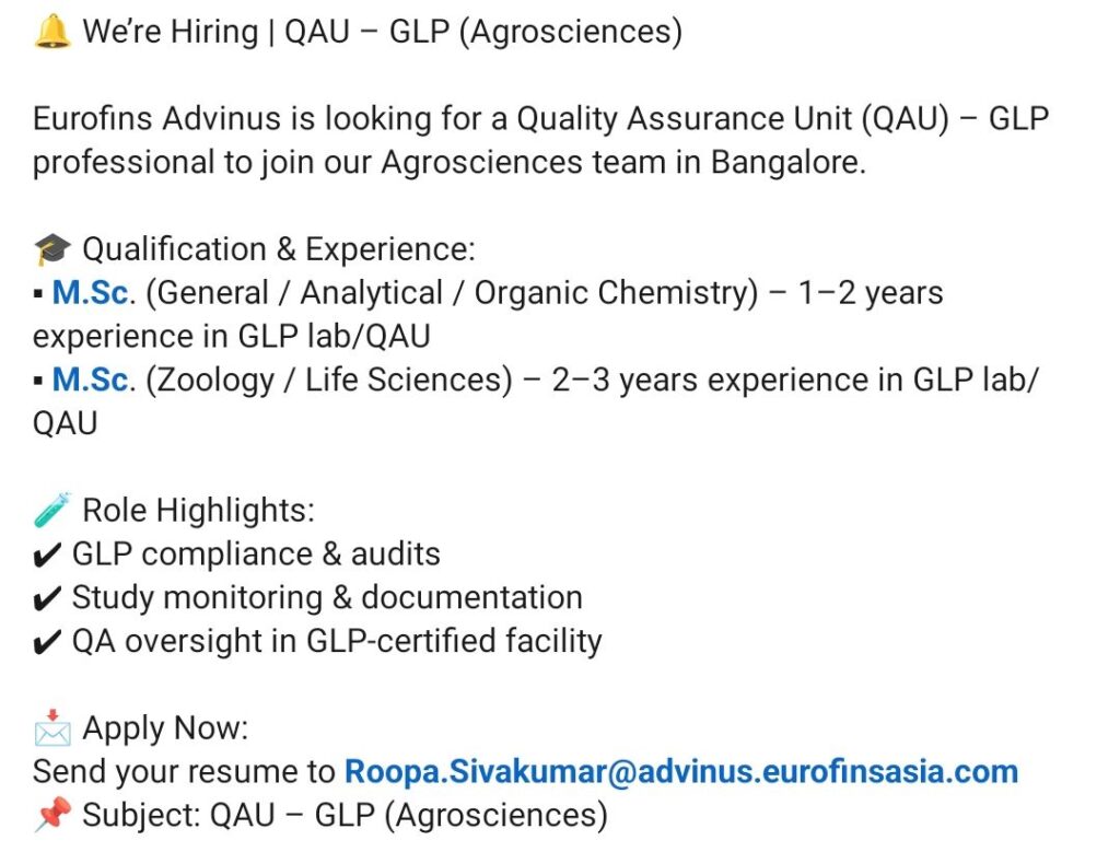 HomeHomeQA Unit (QAU) – GLP Careers at Eurofins Advinus | Agrosciences Team, Bangalore QA Unit (QAU) – GLP Careers at Eurofins Advinus | Agrosciences Team, Bangalore chandrakanth January 14, 2026 Post Views: 14 Related posts: SSterling Hospitals Hiring 2025 | Medical Officer, Staff Nurse & Assistant Manager Jobs AP కాంట్రాక్ట్ / అవుట్సోర్సింగ్ ఉద్యోగాలు 2025 | RMC Jobs Recruitment 2025 | అర్హత & దరఖాస్తు వివరాలు BI Analyst Hiring | Data Analytics Job | 2+ Years Experience Hiring Regulatory Writer for Clinical Documents (CSR, Protocol, ICF, IB) – Hybrid Role Share Pinterest Tweet Email Linkedin Whatsapp Telegram Prev Article Next Article Leave a Reply Cancel Reply Save my name, email, and website in this browser for the next time I comment.