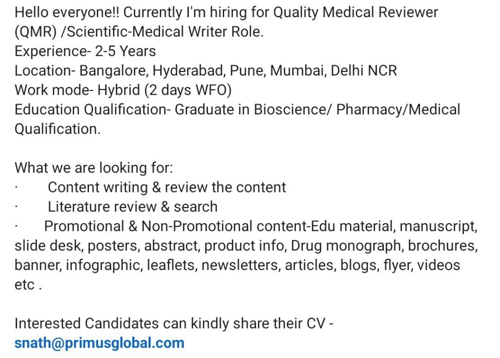 HomeHomeQuality Medical Reviewer & Scientific Writer Job Opening | 2-5 Years Exp | Hybrid Role | Bangalore, Hyderabad, Pune, Mumbai, Delhi NCR Quality Medical Reviewer & Scientific Writer Job Opening | 2-5 Years Exp | Hybrid Role | Bangalore, Hyderabad, Pune, Mumbai, Delhi NCR chandrakanth January 13, 2026 Post Views: 8 Related posts: SSterling Hospitals Hiring 2025 | Medical Officer, Staff Nurse & Assistant Manager Jobs AP కాంట్రాక్ట్ / అవుట్సోర్సింగ్ ఉద్యోగాలు 2025 | RMC Jobs Recruitment 2025 | అర్హత & దరఖాస్తు వివరాలు BI Analyst Hiring | Data Analytics Job | 2+ Years Experience Hiring Regulatory Writer for Clinical Documents (CSR, Protocol, ICF, IB) – Hybrid Role Share Pinterest Tweet Email Linkedin Whatsapp Telegram Prev Article Next Article Leave a Reply Cancel Reply Save my name, email, and website in this browser for the next time I comment.