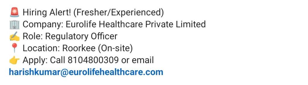 Regulatory Officer Job in Roorkee – Hiring at Eurolife Healthcare (Fresher/Experienced)