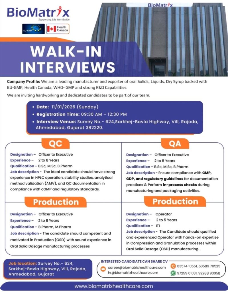 HomePharma JobsWalk-In Interview at BioMatrix Ahmedabad | QC, QA, Production Jobs | 11 Jan 2026 Walk-In Interview at BioMatrix Ahmedabad | QC, QA, Production Jobs | 11 Jan 2026 chandrakanth January 9, 2026 Post Views: 27 Related posts: Unilever Jobs for Freshers | Associate Global Market Vigilance (Pharmacovigilance) Sun Pharmaceutical Industries Hiring 2026 | Executive – Analytical Development R&D Jobs – Baroda “Intas Pharmaceuticals Walk In Drive 2025 | Jobs in Multiple Departments” Merck Business Executive Job for Fresh Graduates | Pharma Careers India Share Pinterest Tweet Email Linkedin Whatsapp Telegram Prev Article Next Article Leave a Reply Cancel Reply Save my name, email, and website in this browser for the next time I comment.