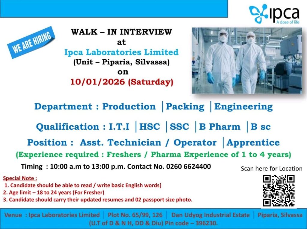 HomePharma JobsWalk-in Interview at Ipca Laboratories Ltd., Silvassa | Production, Packing & Engineering Roles Walk-in Interview at Ipca Laboratories Ltd., Silvassa | Production, Packing & Engineering Roles chandrakanth January 3, 2026 Post Views: 23 Related posts: Unilever Jobs for Freshers | Associate Global Market Vigilance (Pharmacovigilance) Lupin Walk-In Interview 2026 | QC & Production Jobs – Madhya Pradesh “Samnan Chemicals Careers 2025 | Hiring Freshers for Research Associate Chemical Synthesis” “Intas Pharmaceuticals Careers 2025 | Hiring for Manufacturing Upstream Fractionation and Downstream” Share Pinterest Tweet Email Linkedin Whatsapp Telegram Prev Article Next Article Leave a Reply Cancel Reply Save my name, email, and website in this browser for the next time I comment.