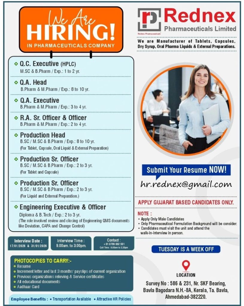 HomeHomeWalk-In Interview for Pharma Jobs in Ahmedabad: QC (HPLC), QA, Production & Engineering Roles Walk-In Interview for Pharma Jobs in Ahmedabad: QC (HPLC), QA, Production & Engineering Roles chandrakanth January 17, 2026 Post Views: 7 Related posts: SSterling Hospitals Hiring 2025 | Medical Officer, Staff Nurse & Assistant Manager Jobs AP కాంట్రాక్ట్ / అవుట్సోర్సింగ్ ఉద్యోగాలు 2025 | RMC Jobs Recruitment 2025 | అర్హత & దరఖాస్తు వివరాలు Walk-in Interview at Cipla for OSD Operators & Officers | Patalganga, 8-9 Jan 2026 Hiring: Scientific/Medical Writer (Publications) – Remote India, Up to ₹20 LPA Share Pinterest Tweet Email Linkedin Whatsapp Telegram Prev Article Next Article Leave a Reply Cancel Reply Save my name, email, and website in this browser for the next time I comment.