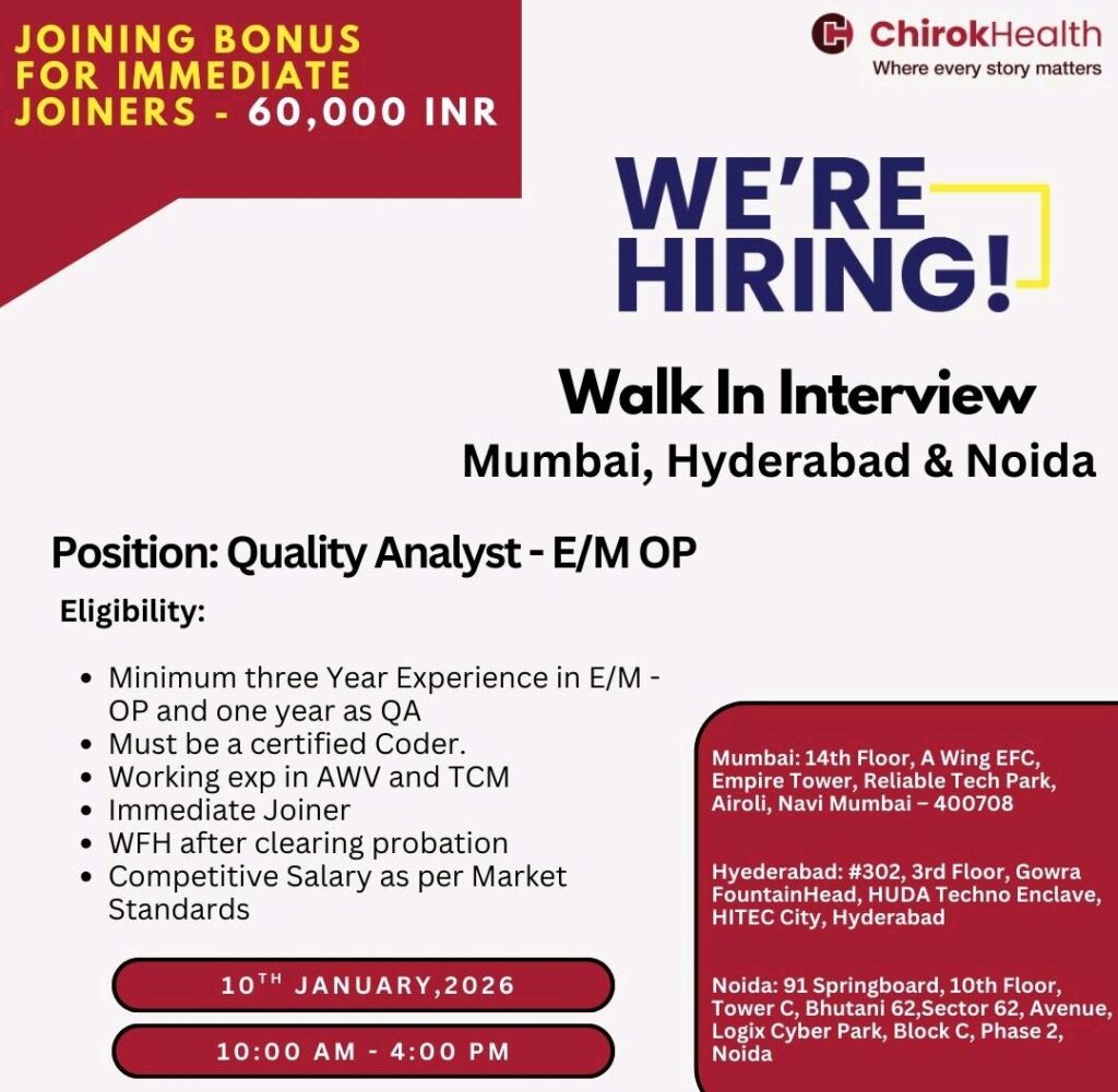 Walk In Interview for Quality Analyst (E/M OP) – Mumbai, Hyderabad, Noida | ₹60k Joining Bonus