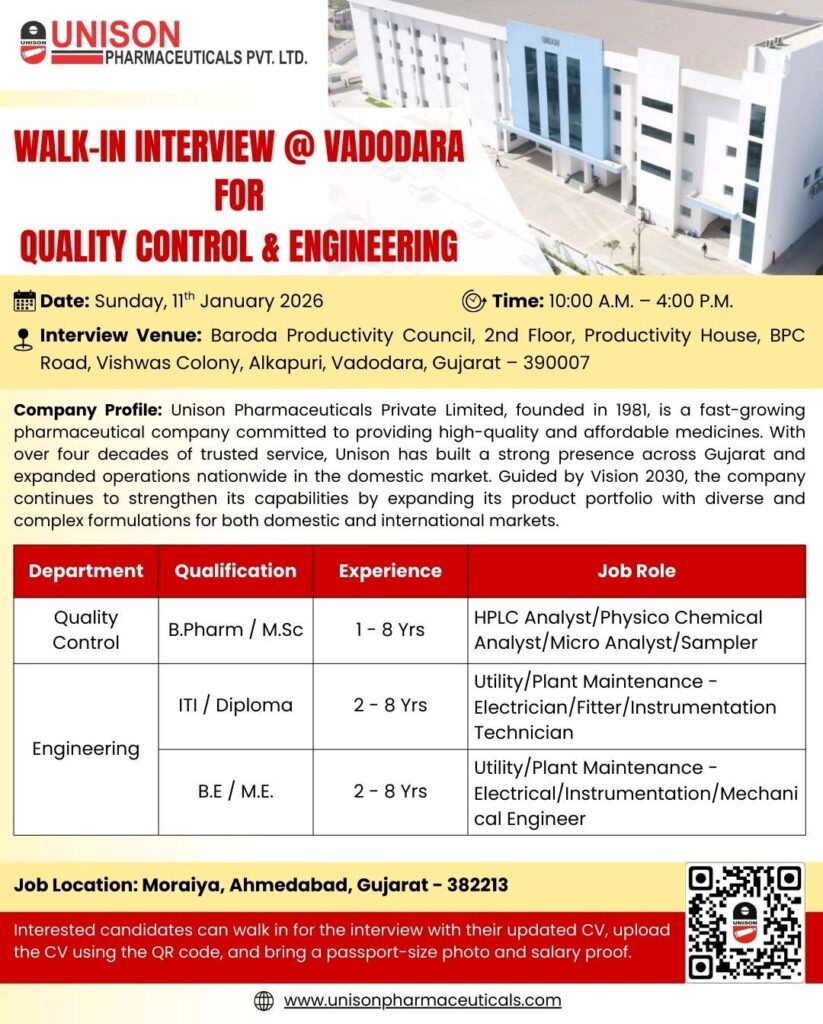 Walk-In Interview @ Vadodara | QC & Engineering Jobs | Unison Pharmaceuticals