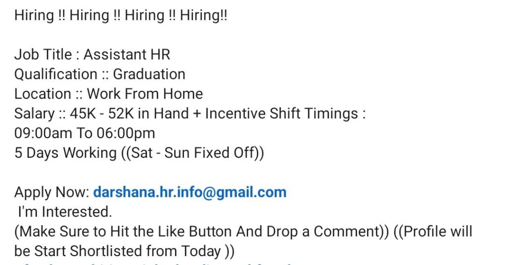 Work From Home Assistant HR Job – 45K-52K in Hand + Incentives (Sat-Sun Off)