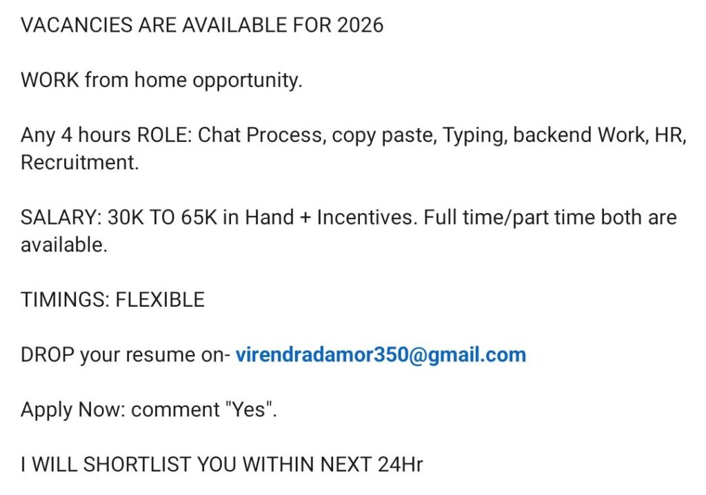 HomeHome2026 Work From Home Hiring: Data Entry, HR, Recruitment Roles (Freshers Welcome) 2026 Work From Home Hiring: Data Entry, HR, Recruitment Roles (Freshers Welcome) chandrakanth February 18, 2026 Post Views: 4 Related posts: SSterling Hospitals Hiring 2025 | Medical Officer, Staff Nurse & Assistant Manager Jobs AP కాంట్రాక్ట్ / అవుట్సోర్సింగ్ ఉద్యోగాలు 2025 | RMC Jobs Recruitment 2025 | అర్హత & దరఖాస్తు వివరాలు Sai Life Sciences Walk-In Interview 2026 | Analytical R&D (API) Jobs – Hyderabad Work From Home HR Jobs | Freshers Eligible | ₹30K-58K Salary + Incentives | Monday-Friday Share Pinterest Tweet Email Linkedin Whatsapp Telegram Prev Article Next Article Leave a Reply Cancel Reply Save my name, email, and website in this browser for the next time I comment.
