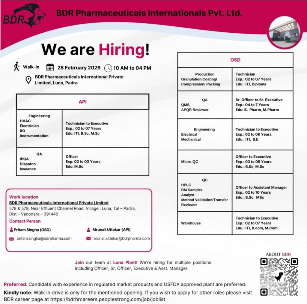 HomeHomeBDR Pharmaceuticals Walk-in 2026 for Production, QC, QA & Engineering Roles BDR Pharmaceuticals Walk-in 2026 for Production, QC, QA & Engineering Roles chandrakanth February 25, 2026 Post Views: 3 Related posts: SSterling Hospitals Hiring 2025 | Medical Officer, Staff Nurse & Assistant Manager Jobs AP కాంట్రాక్ట్ / అవుట్సోర్సింగ్ ఉద్యోగాలు 2025 | RMC Jobs Recruitment 2025 | అర్హత & దరఖాస్తు వివరాలు Sai Life Sciences Walk-In Interview 2026 | Analytical R&D (API) Jobs – Hyderabad Walk-In Interview for Pharma Jobs in Ahmedabad: QC (HPLC), QA, Production & Engineering Roles Share Pinterest Tweet Email Linkedin Whatsapp Telegram Prev Article Next Article Leave a Reply Cancel Reply Save my name, email, and website in this browser for the next time I comment.