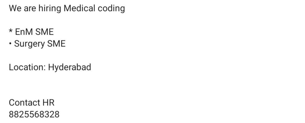 HomeHomeBest Medical Coding Jobs in Hyderabad | SME Openings for EnM and Surgery Best Medical Coding Jobs in Hyderabad | SME Openings for EnM and Surgery chandrakanth February 28, 2026 Post Views: 3 Related posts: SSterling Hospitals Hiring 2025 | Medical Officer, Staff Nurse & Assistant Manager Jobs AP కాంట్రాక్ట్ / అవుట్సోర్సింగ్ ఉద్యోగాలు 2025 | RMC Jobs Recruitment 2025 | అర్హత & దరఖాస్తు వివరాలు Sai Life Sciences Walk-In Interview 2026 | Analytical R&D (API) Jobs – Hyderabad HCC Coder WFH Opportunity | Urgent Hiring | Salary up to ₹50,000 Share Pinterest Tweet Email Linkedin Whatsapp Telegram Prev Article Next Article Leave a Reply Cancel Reply Save my name, email, and website in this browser for the next time I comment.