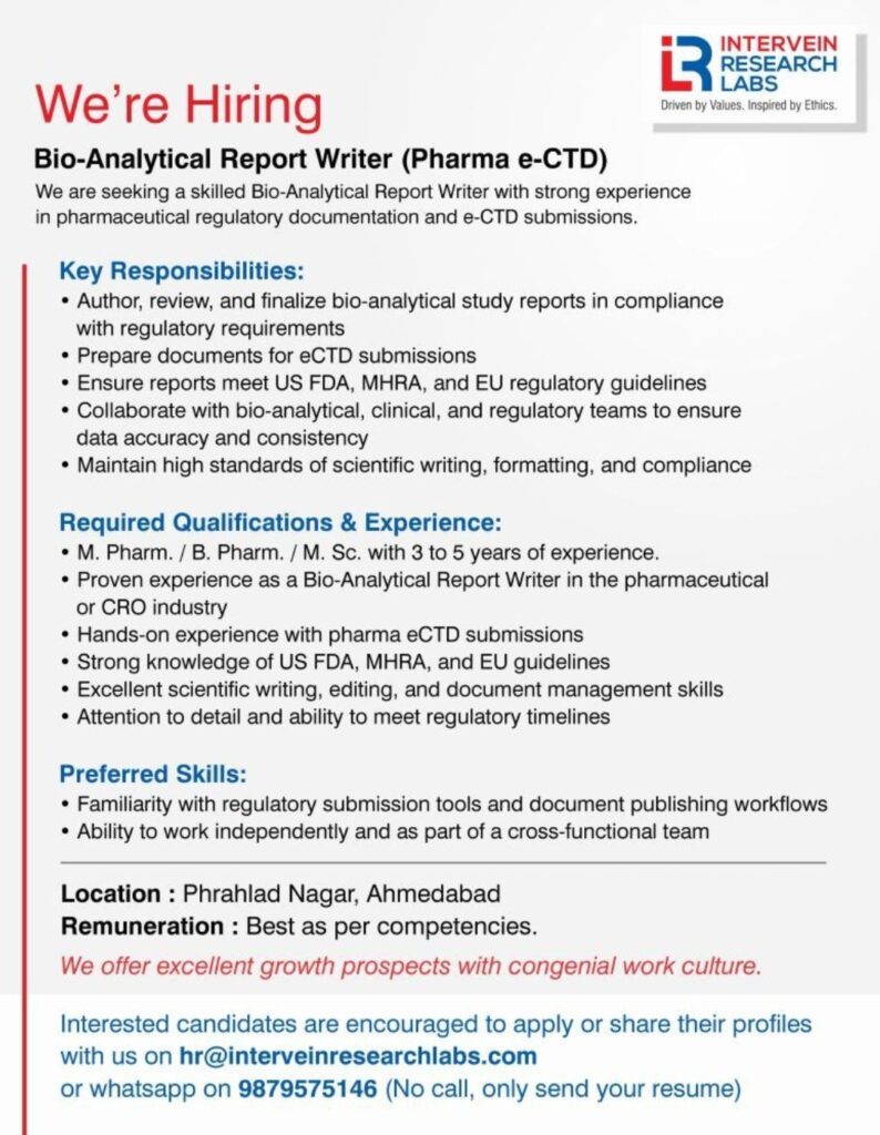 Bio-Analytical Report Writer (Pharma e-CTD) Job in Ahmedabad | Intervein Research Labs