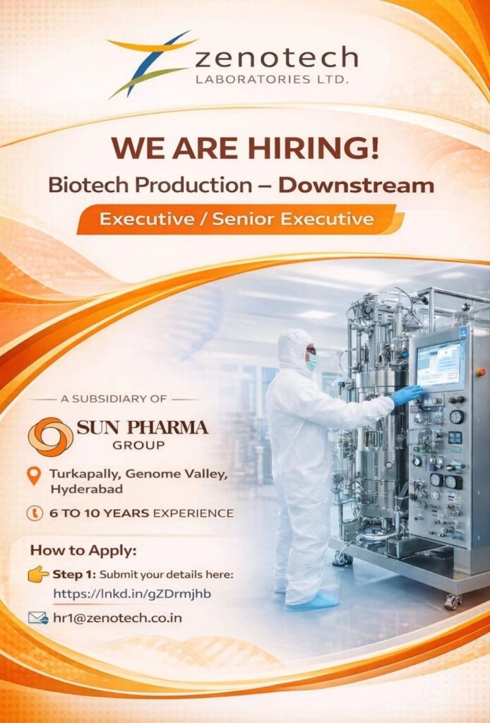 Biotech Downstream Senior Executive Job in Hyderabad | Genome Valley | Sun Pharma Group
