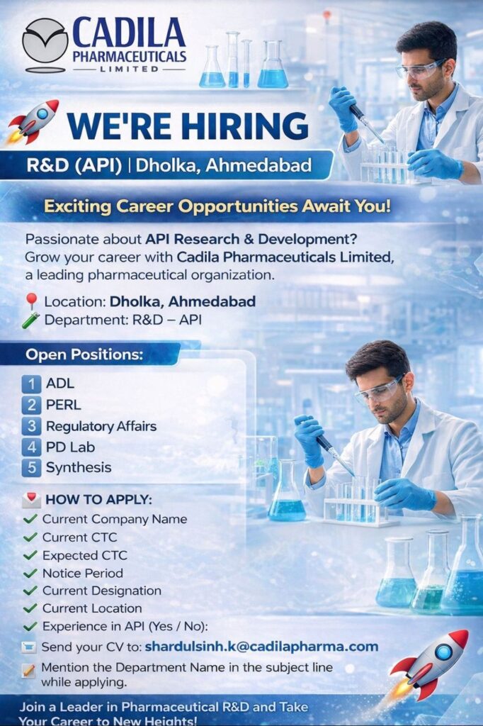HomeHomeCadila Pharmaceuticals Hiring R&D API | Dholka, Ahmedabad | ADL, PERL, Regulatory Affairs Openings Cadila Pharmaceuticals Hiring R&D API | Dholka, Ahmedabad | ADL, PERL, Regulatory Affairs Openings chandrakanth February 25, 2026 Post Views: 3 Related posts: SSterling Hospitals Hiring 2025 | Medical Officer, Staff Nurse & Assistant Manager Jobs AP కాంట్రాక్ట్ / అవుట్సోర్సింగ్ ఉద్యోగాలు 2025 | RMC Jobs Recruitment 2025 | అర్హత & దరఖాస్తు వివరాలు Sai Life Sciences Walk-In Interview 2026 | Analytical R&D (API) Jobs – Hyderabad Walk-In Interview for Pharma Jobs in Ahmedabad: QC (HPLC), QA, Production & Engineering Roles Share Pinterest Tweet Email Linkedin Whatsapp Telegram Prev Article Next Article Leave a Reply Cancel Reply Save my name, email, and website in this browser for the next time I comment.