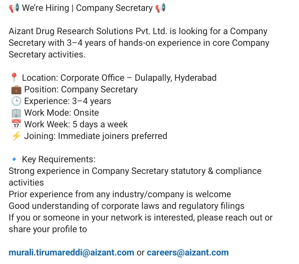 HomePharma JobsCompany Secretary Opening at Aizant – Dulapally, Hyderabad | Apply Now Company Secretary Opening at Aizant – Dulapally, Hyderabad | Apply Now chandrakanth February 10, 2026 Post Views: 2 Related posts: Unilever Jobs for Freshers | Associate Global Market Vigilance (Pharmacovigilance) Sun Pharmaceutical Industries Hiring 2026 | Executive – Analytical Development R&D Jobs – Baroda “Intas Pharmaceuticals Walk In Drive 2025 | Jobs in Multiple Departments” “Lubrizol Careers 2025 | Hiring Production Executive – Navi Mumbai Maharashtra” Share Pinterest Tweet Email Linkedin Whatsapp Telegram Prev Article Next Article Leave a Reply Cancel Reply Save my name, email, and website in this browser for the next time I comment.