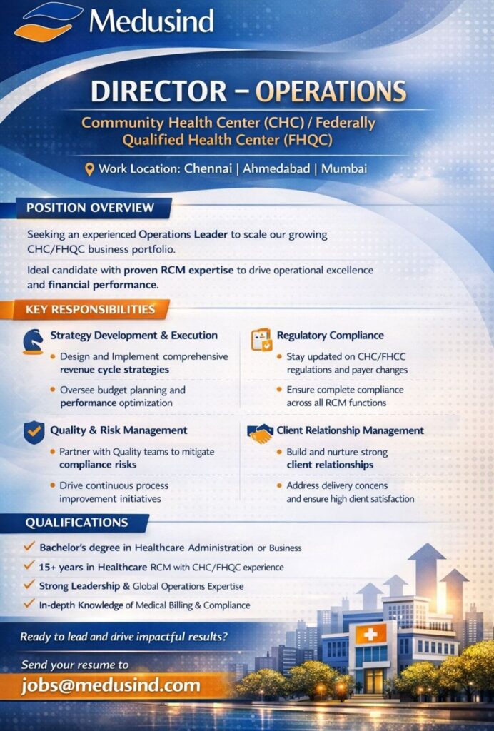 HomeHomeDirector – Operations (CHC/FQHC) Job in Chennai, Ahmedabad & Mumbai | Medusind Careers Director – Operations (CHC/FQHC) Job in Chennai, Ahmedabad & Mumbai | Medusind Careers chandrakanth February 27, 2026 Post Views: 2 Related posts: SSterling Hospitals Hiring 2025 | Medical Officer, Staff Nurse & Assistant Manager Jobs AP కాంట్రాక్ట్ / అవుట్సోర్సింగ్ ఉద్యోగాలు 2025 | RMC Jobs Recruitment 2025 | అర్హత & దరఖాస్తు వివరాలు Sai Life Sciences Walk-In Interview 2026 | Analytical R&D (API) Jobs – Hyderabad HCC Coder WFH Opportunity | Urgent Hiring | Salary up to ₹50,000 Share Pinterest Tweet Email Linkedin Whatsapp Telegram Prev Article Next Article Leave a Reply Cancel Reply Save my name, email, and website in this browser for the next time I comment.