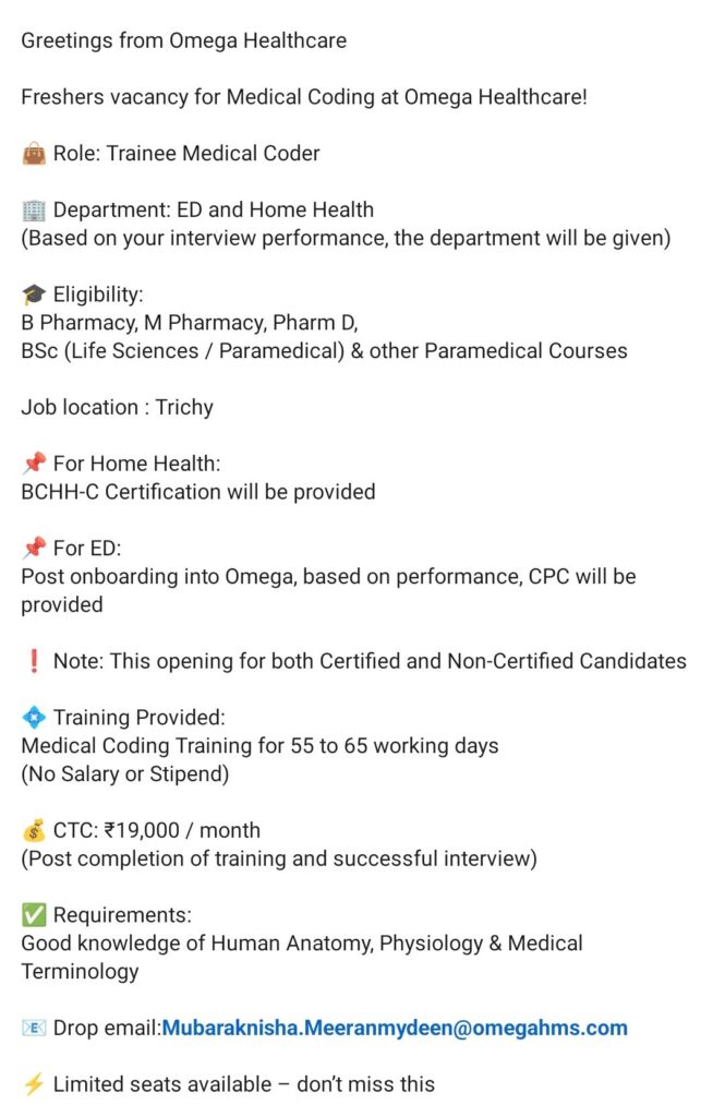 HomeHomeFreshers Medical Coding Vacancy in Trichy | Omega Healthcare Apply Now Freshers Medical Coding Vacancy in Trichy | Omega Healthcare Apply Now chandrakanth February 27, 2026 Post Views: 2 Related posts: SSterling Hospitals Hiring 2025 | Medical Officer, Staff Nurse & Assistant Manager Jobs AP కాంట్రాక్ట్ / అవుట్సోర్సింగ్ ఉద్యోగాలు 2025 | RMC Jobs Recruitment 2025 | అర్హత & దరఖాస్తు వివరాలు Sai Life Sciences Walk-In Interview 2026 | Analytical R&D (API) Jobs – Hyderabad HCC Coder WFH Opportunity | Urgent Hiring | Salary up to ₹50,000 Share Pinterest Tweet Email Linkedin Whatsapp Telegram Prev Article Next Article Leave a Reply Cancel Reply Save my name, email, and website in this browser for the next time I comment.