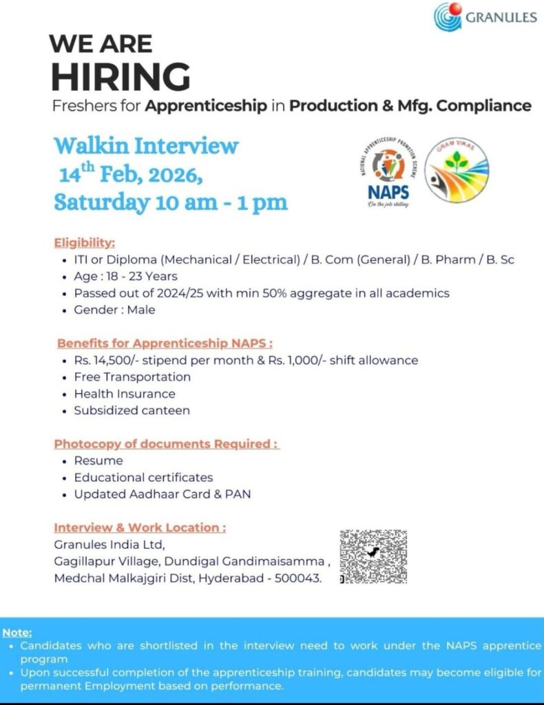 HomePharma JobsGranules India Apprenticeship Walkin 2026 | Production & Mfg Compliance | Hyderabad | Male Freshers (2024/25) Granules India Apprenticeship Walkin 2026 | Production & Mfg Compliance | Hyderabad | Male Freshers (2024/25) chandrakanth February 11, 2026 Post Views: 3 Related posts: Unilever Jobs for Freshers | Associate Global Market Vigilance (Pharmacovigilance) Sun Pharmaceutical Industries Hiring 2026 | Executive – Analytical Development R&D Jobs – Baroda “Intas Pharmaceuticals Walk In Drive 2025 | Jobs in Multiple Departments” “Lubrizol Careers 2025 | Hiring Production Executive – Navi Mumbai Maharashtra” Share Pinterest Tweet Email Linkedin Whatsapp Telegram Prev Article Next Article Leave a Reply Cancel Reply Save my name, email, and website in this browser for the next time I comment.