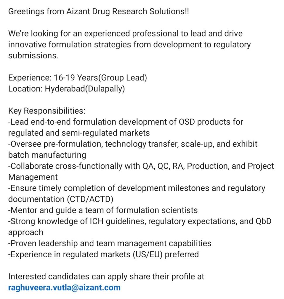 HomeHomeGroup Lead Formulation Development Job Openings at Aizant | OSD | Hyderabad Group Lead Formulation Development Job Openings at Aizant | OSD | Hyderabad chandrakanth February 26, 2026 Post Views: 1 Related posts: SSterling Hospitals Hiring 2025 | Medical Officer, Staff Nurse & Assistant Manager Jobs AP కాంట్రాక్ట్ / అవుట్సోర్సింగ్ ఉద్యోగాలు 2025 | RMC Jobs Recruitment 2025 | అర్హత & దరఖాస్తు వివరాలు Sai Life Sciences Walk-In Interview 2026 | Analytical R&D (API) Jobs – Hyderabad HCC Coder WFH Opportunity | Urgent Hiring | Salary up to ₹50,000 Share Pinterest Tweet Email Linkedin Whatsapp Telegram Prev Article Leave a Reply Cancel Reply Save my name, email, and website in this browser for the next time I comment.