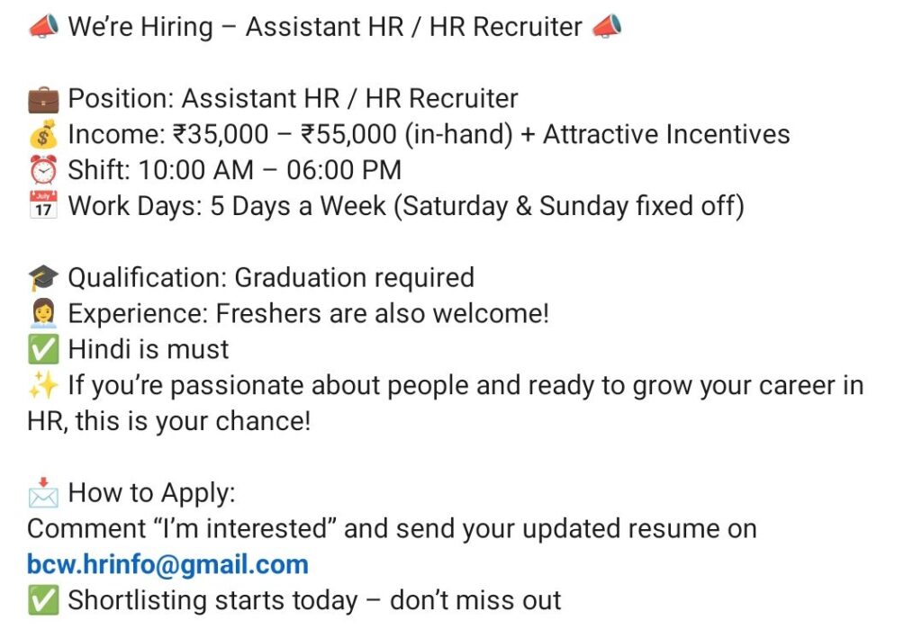 Hiring Assistant HR / HR Recruiter – Freshers Welcome | ₹35k–55k + Incentives | 5 Days Work | Apply Now via Email