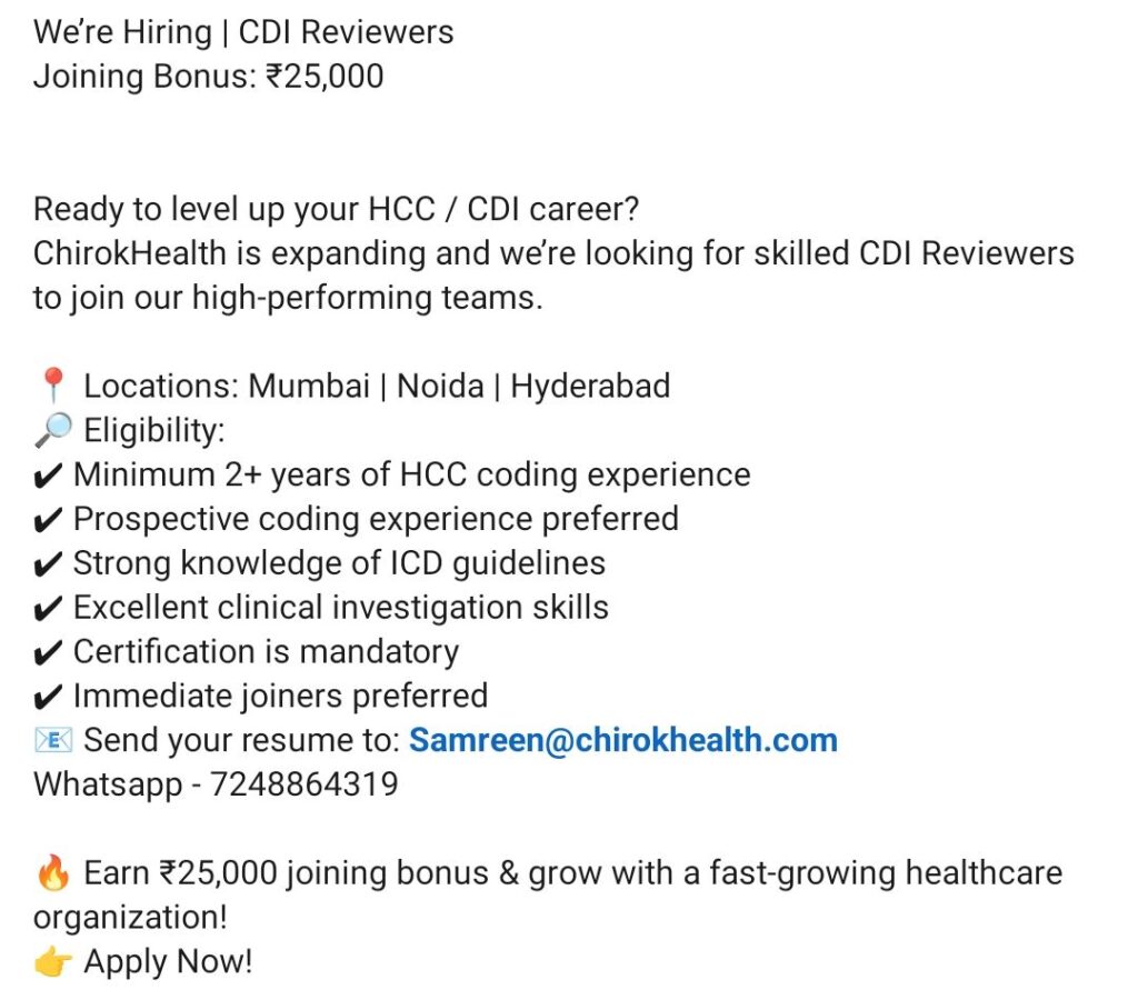 Hiring CDI Reviewers | ₹25,000 Joining Bonus | Mumbai, Noida, Hyderabad | ChirokHealth