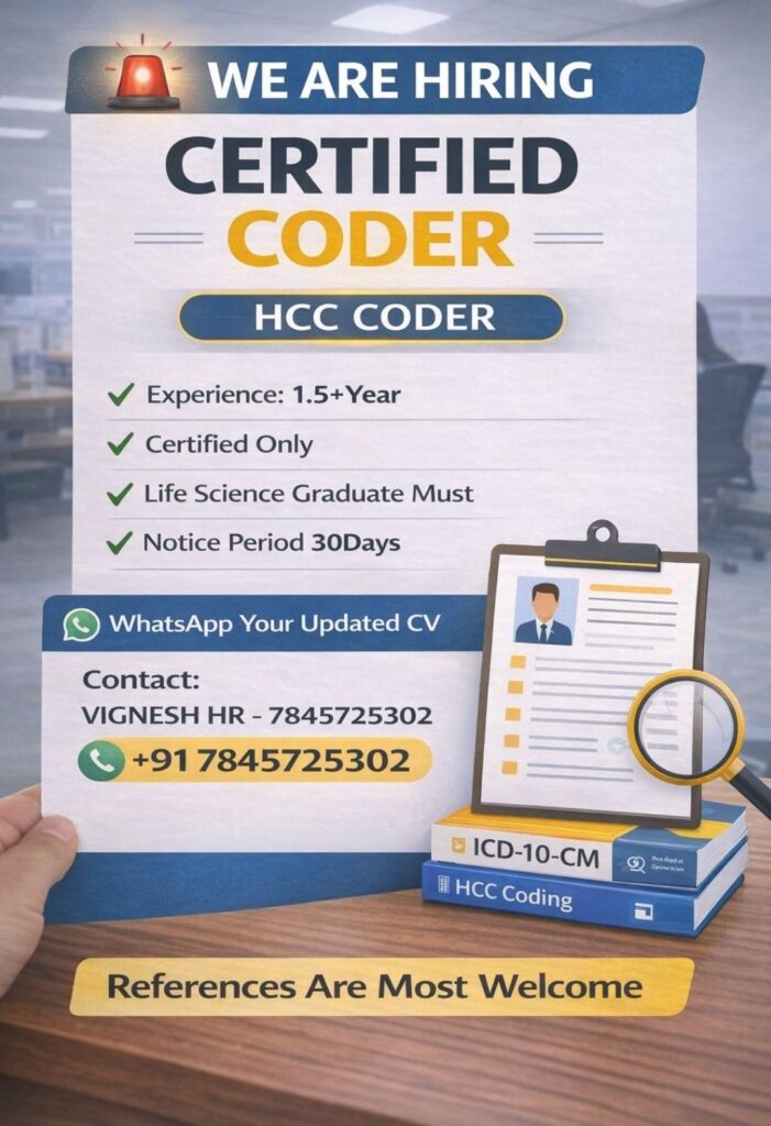 HomeHomeHiring Certified HCC Coder | Life Science Graduate | ICD-10-CM Expert | 1.5+ Years Experience Hiring Certified HCC Coder | Life Science Graduate | ICD-10-CM Expert | 1.5+ Years Experience chandrakanth February 20, 2026 Post Views: 1 Related posts: SSterling Hospitals Hiring 2025 | Medical Officer, Staff Nurse & Assistant Manager Jobs AP కాంట్రాక్ట్ / అవుట్సోర్సింగ్ ఉద్యోగాలు 2025 | RMC Jobs Recruitment 2025 | అర్హత & దరఖాస్తు వివరాలు Sai Life Sciences Walk-In Interview 2026 | Analytical R&D (API) Jobs – Hyderabad Work From Home HR Jobs | Freshers Eligible | ₹30K-58K Salary + Incentives | Monday-Friday Share Pinterest Tweet Email Linkedin Whatsapp Telegram Prev Article Leave a Reply Cancel Reply Save my name, email, and website in this browser for the next time I comment.