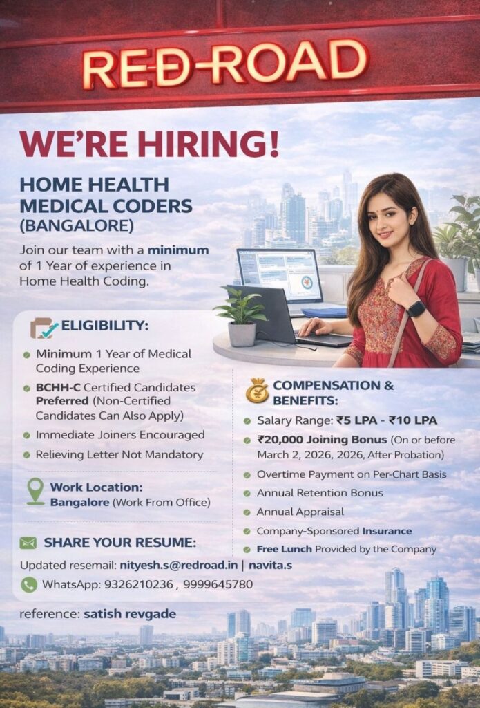 HomeHomeHiring Home Health Medical Coders in Bangalore | BCHH-C Preferred | Salary up to ₹10 LPA + Benefits Hiring Home Health Medical Coders in Bangalore | BCHH-C Preferred | Salary up to ₹10 LPA + Benefits chandrakanth February 22, 2026 Post Views: 27 Related posts: SSterling Hospitals Hiring 2025 | Medical Officer, Staff Nurse & Assistant Manager Jobs AP కాంట్రాక్ట్ / అవుట్సోర్సింగ్ ఉద్యోగాలు 2025 | RMC Jobs Recruitment 2025 | అర్హత & దరఖాస్తు వివరాలు Sai Life Sciences Walk-In Interview 2026 | Analytical R&D (API) Jobs – Hyderabad Work From Home HR Jobs | Freshers Eligible | ₹30K-58K Salary + Incentives | Monday-Friday Share Pinterest Tweet Email Linkedin Whatsapp Telegram Prev Article Next Article Leave a Reply Cancel Reply Save my name, email, and website in this browser for the next time I comment.