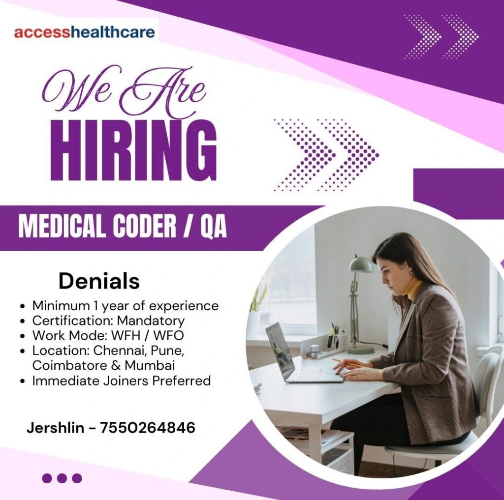 HomeHomeHiring Medical Coder / QA Denials | Work From Home WFO | Chennai Pune Coimbatore Mumbai Hiring Medical Coder / QA Denials | Work From Home WFO | Chennai Pune Coimbatore Mumbai chandrakanth February 27, 2026 Post Views: 2 Related posts: SSterling Hospitals Hiring 2025 | Medical Officer, Staff Nurse & Assistant Manager Jobs AP కాంట్రాక్ట్ / అవుట్సోర్సింగ్ ఉద్యోగాలు 2025 | RMC Jobs Recruitment 2025 | అర్హత & దరఖాస్తు వివరాలు Sai Life Sciences Walk-In Interview 2026 | Analytical R&D (API) Jobs – Hyderabad HCC Coder WFH Opportunity | Urgent Hiring | Salary up to ₹50,000 Share Pinterest Tweet Email Linkedin Whatsapp Telegram Prev Article Next Article Leave a Reply Cancel Reply Save my name, email, and website in this browser for the next time I comment.