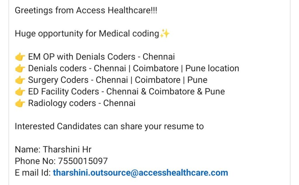 Hiring Medical Coders – Multiple Specialties (Access Healthcare) – Freshers & Experienced