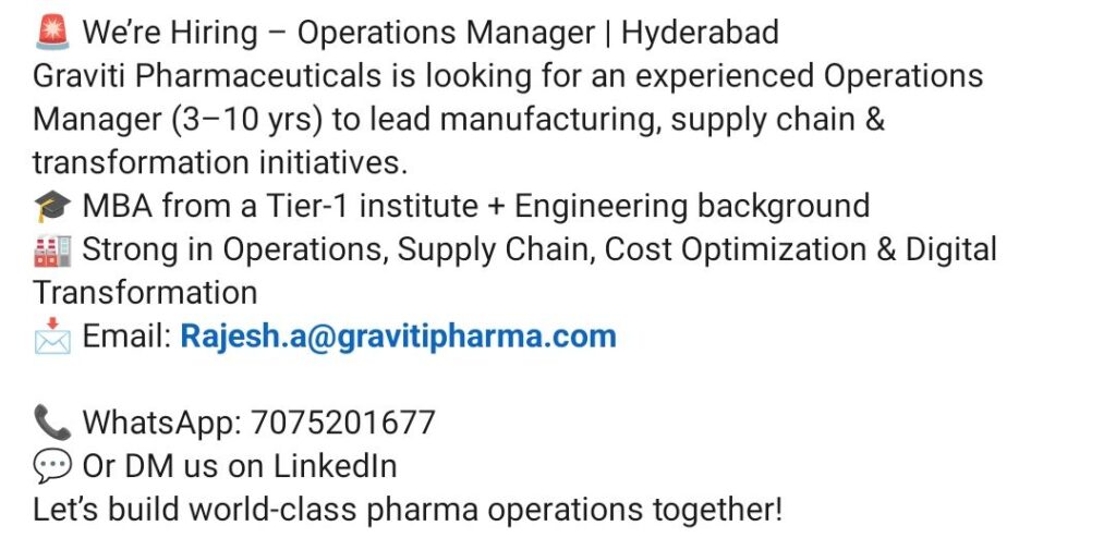 HomeHomeHiring Operations Manager – Pharma Manufacturing & Supply Chain | Graviti Pharma | Hyderabad Hiring Operations Manager – Pharma Manufacturing & Supply Chain | Graviti Pharma | Hyderabad chandrakanth February 12, 2026 Post Views: 1 Related posts: SSterling Hospitals Hiring 2025 | Medical Officer, Staff Nurse & Assistant Manager Jobs AP కాంట్రాక్ట్ / అవుట్సోర్సింగ్ ఉద్యోగాలు 2025 | RMC Jobs Recruitment 2025 | అర్హత & దరఖాస్తు వివరాలు Clinical Research Coordinator (CRC) Job in Pune – Agenome Research Hiring DMPK Certificate Program: Drug Metabolism & Pharmacokinetics Course by Syngene & JSS AHER Share Pinterest Tweet Email Linkedin Whatsapp Telegram Prev Article Leave a Reply Cancel Reply Save my name, email, and website in this browser for the next time I comment.