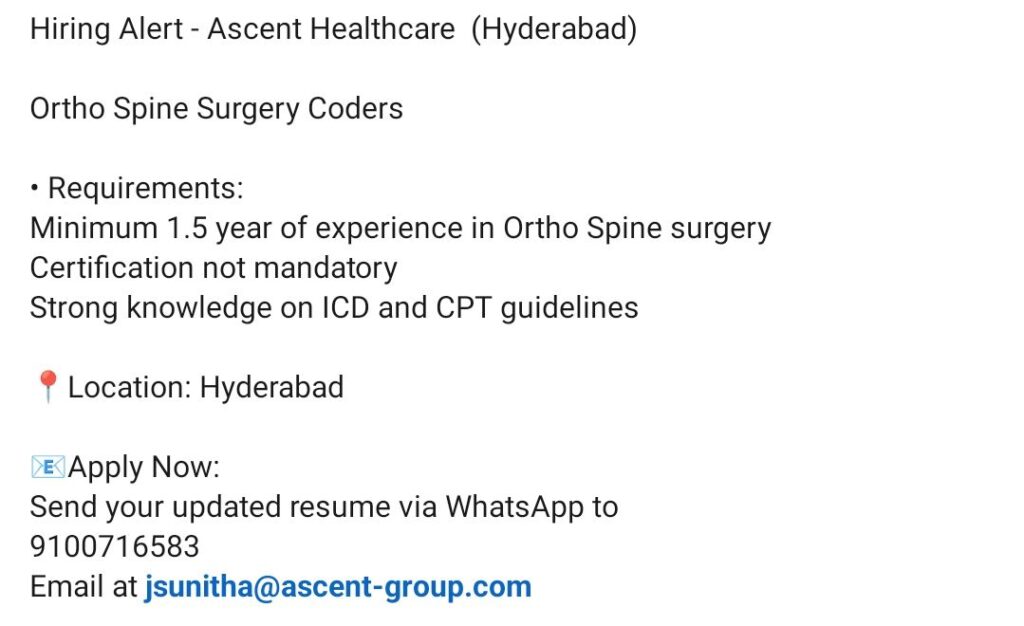 HomeHomeHiring Ortho Spine Surgery Coders – Hyderabad | Ascent Healthcare Hiring Ortho Spine Surgery Coders – Hyderabad | Ascent Healthcare chandrakanth February 28, 2026 Post Views: 2 Related posts: SSterling Hospitals Hiring 2025 | Medical Officer, Staff Nurse & Assistant Manager Jobs AP కాంట్రాక్ట్ / అవుట్సోర్సింగ్ ఉద్యోగాలు 2025 | RMC Jobs Recruitment 2025 | అర్హత & దరఖాస్తు వివరాలు Sai Life Sciences Walk-In Interview 2026 | Analytical R&D (API) Jobs – Hyderabad HCC Coder WFH Opportunity | Urgent Hiring | Salary up to ₹50,000 Share Pinterest Tweet Email Linkedin Whatsapp Telegram Prev Article Next Article Leave a Reply Cancel Reply Save my name, email, and website in this browser for the next time I comment.