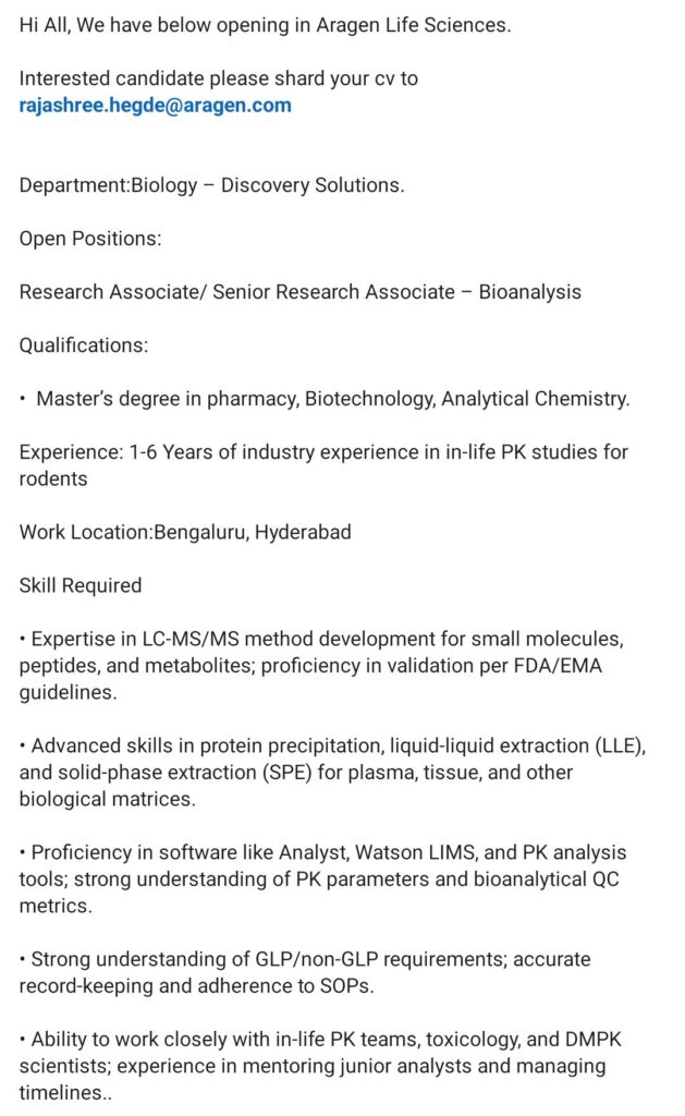 Hiring: Research Associate Bioanalysis – LC-MS/MS Method Development (1-6 Yrs Exp)