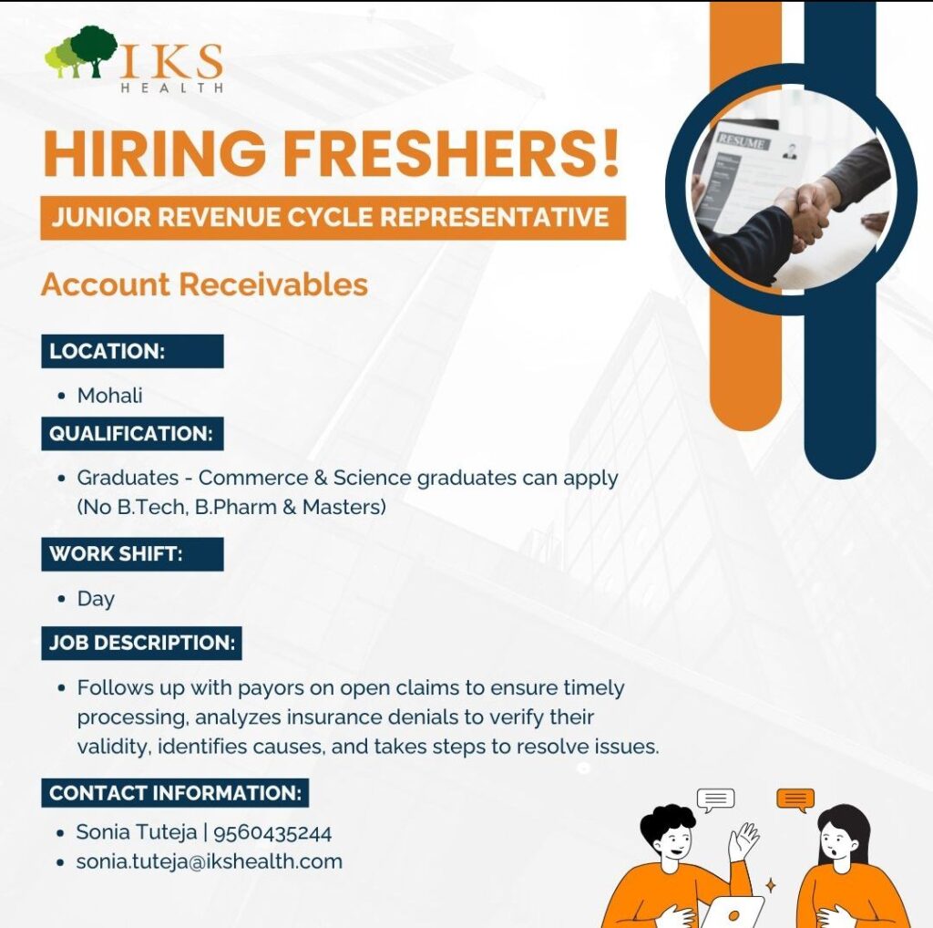 HomePharma JobsIKS Health Hiring Freshers 2025 | Junior Revenue Cycle Representative | Mohali IKS Health Hiring Freshers 2025 | Junior Revenue Cycle Representative | Mohali chandrakanth February 18, 2026 Post Views: 3 Related posts: Unilever Jobs for Freshers | Associate Global Market Vigilance (Pharmacovigilance) Sun Pharmaceutical Industries Hiring 2026 | Executive – Analytical Development R&D Jobs – Baroda “Intas Pharmaceuticals Walk In Drive 2025 | Jobs in Multiple Departments” “Lubrizol Careers 2025 | Hiring Production Executive – Navi Mumbai Maharashtra” Share Pinterest Tweet Email Linkedin Whatsapp Telegram Prev Article Next Article Leave a Reply Cancel Reply Save my name, email, and website in this browser for the next time I comment.