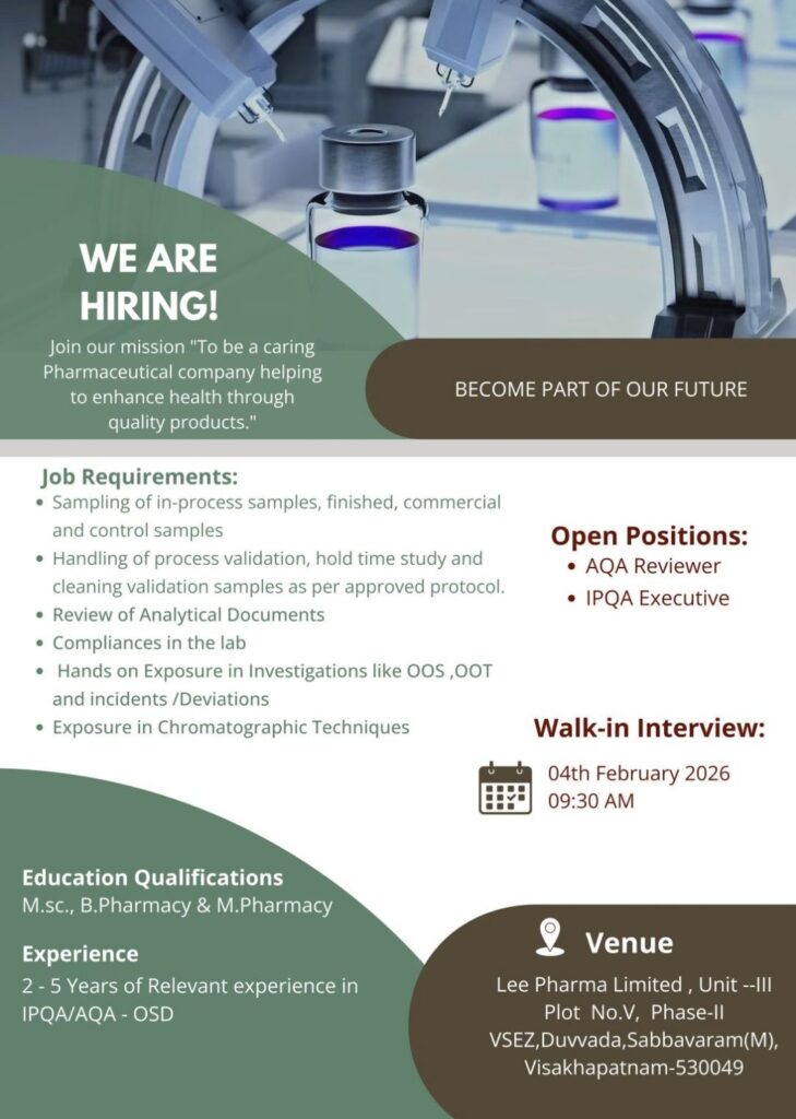 IPQA AQA Jobs for M.Pharmacy Freshers & Experienced – Lee Pharma Walk-in Drive