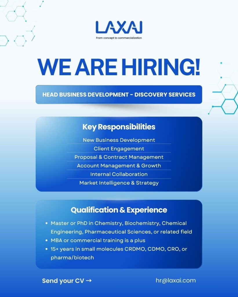HomeHomeLAXAI Hiring Head Business Development-Discovery Services | 15+ Years Exp | PhD | Small Molecules CRDMO/CDMO LAXAI Hiring Head Business Development-Discovery Services | 15+ Years Exp | PhD | Small Molecules CRDMO/CDMO chandrakanth February 13, 2026 Post Views: 4 Related posts: SSterling Hospitals Hiring 2025 | Medical Officer, Staff Nurse & Assistant Manager Jobs Clinical Research Coordinator (CRC) Job in Pune – Agenome Research Hiring DMPK Certificate Program: Drug Metabolism & Pharmacokinetics Course by Syngene & JSS AHER Work From Home Job for Graduates | 35K-40K Salary | 5 Days Working (Sat-Sun Off) Share Pinterest Tweet Email Linkedin Whatsapp Telegram Prev Article Next Article Leave a Reply Cancel Reply Save my name, email, and website in this browser for the next time I comment.