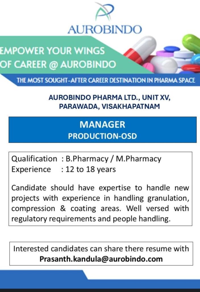• Manager – Production OSD @ Aurobindo Pharma, Vizag | B.Pharm/M.Pharm | 12-18 Yrs Exp