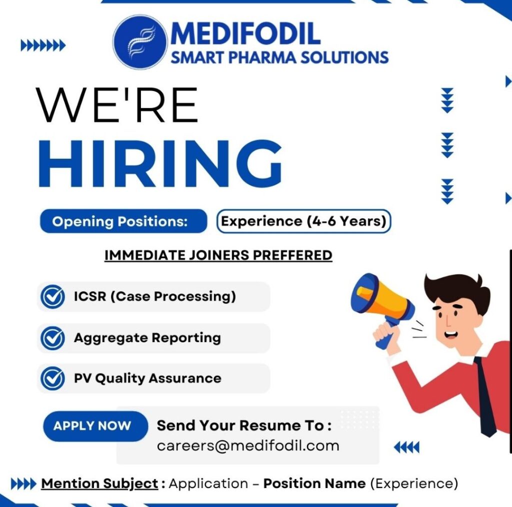 HomeHomeMedifodil Hiring Pharmacovigilance Professionals | ICSR, Aggregate Reporting, PVQA | 4-6 Years Exp | Immediate Joiners Medifodil Hiring Pharmacovigilance Professionals | ICSR, Aggregate Reporting, PVQA | 4-6 Years Exp | Immediate Joiners chandrakanth February 13, 2026 Post Views: 4 Related posts: Clinical Research Coordinator (CRC) Job in Pune – Agenome Research Hiring DMPK Certificate Program: Drug Metabolism & Pharmacokinetics Course by Syngene & JSS AHER Work From Home Job for Graduates | 35K-40K Salary | 5 Days Working (Sat-Sun Off) LAXAI Hiring Head Business Development-Discovery Services | 15+ Years Exp | PhD | Small Molecules CRDMO/CDMO Share Pinterest Tweet Email Linkedin Whatsapp Telegram Prev Article Next Article Leave a Reply Cancel Reply Save my name, email, and website in this browser for the next time I comment.