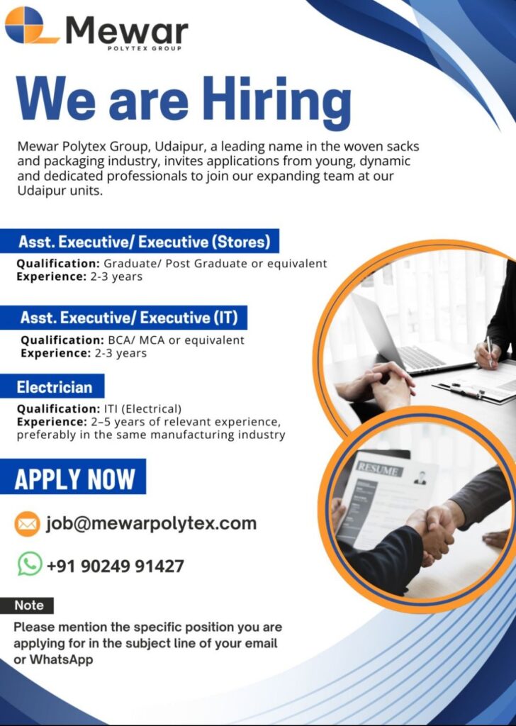 HomePharma JobsMewar Polytex Group Udaipur Jobs 2025 | Assistant Executive, IT, Electrician Vacancies Mewar Polytex Group Udaipur Jobs 2025 | Assistant Executive, IT, Electrician Vacancies chandrakanth February 13, 2026 Post Views: 3 Related posts: Unilever Jobs for Freshers | Associate Global Market Vigilance (Pharmacovigilance) Sun Pharmaceutical Industries Hiring 2026 | Executive – Analytical Development R&D Jobs – Baroda “Intas Pharmaceuticals Walk In Drive 2025 | Jobs in Multiple Departments” “Lubrizol Careers 2025 | Hiring Production Executive – Navi Mumbai Maharashtra” Share Pinterest Tweet Email Linkedin Whatsapp Telegram Prev Article Next Article Leave a Reply Cancel Reply Save my name, email, and website in this browser for the next time I comment.