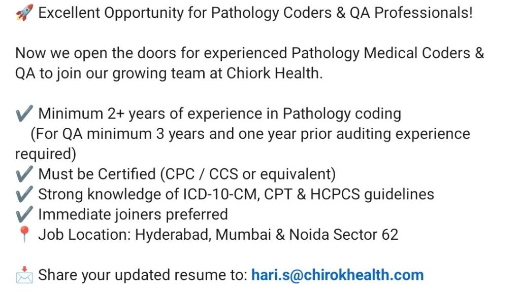 HomeHomePathology Coder Jobs | Medical Coding Vacancy | Chiork Health Hiring Pathology Coder Jobs | Medical Coding Vacancy | Chiork Health Hiring chandrakanth February 27, 2026 Post Views: 2 Related posts: SSterling Hospitals Hiring 2025 | Medical Officer, Staff Nurse & Assistant Manager Jobs AP కాంట్రాక్ట్ / అవుట్సోర్సింగ్ ఉద్యోగాలు 2025 | RMC Jobs Recruitment 2025 | అర్హత & దరఖాస్తు వివరాలు Sai Life Sciences Walk-In Interview 2026 | Analytical R&D (API) Jobs – Hyderabad HCC Coder WFH Opportunity | Urgent Hiring | Salary up to ₹50,000 Share Pinterest Tweet Email Linkedin Whatsapp Telegram Prev Article Next Article Leave a Reply Cancel Reply Save my name, email, and website in this browser for the next time I comment.
